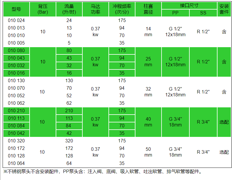 PP或不锈钢泵头材质选择,适用于多种工况及介质条件。