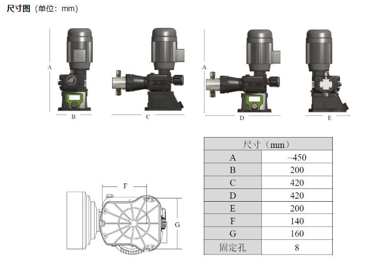 柱塞式计量泵,220V输入电源,内置变频模块,外部讯号控制,LCD显示屏,飞轮旋钮操作。