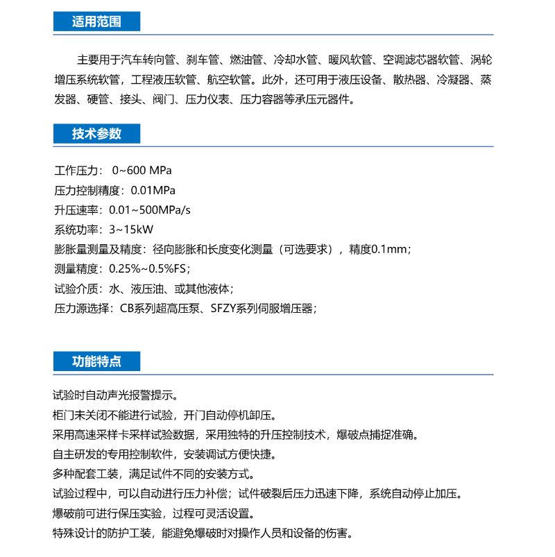 主要用于胶管和胶管总成爆破试验,可进行胶管膨胀量(长度和径向)自动检测。同时,还可用于各种小型管件、接头等承元器件进行爆破压力试验。