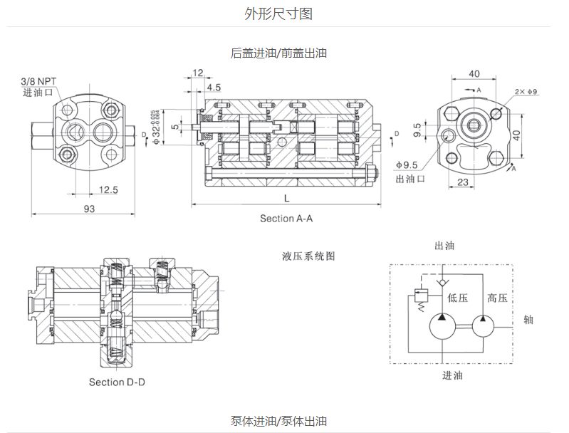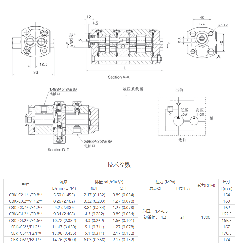 CBK双联齿轮泵是由一个大排量低压泵、小排量高压泵、一个单向阀和一个卸荷阀组成。
