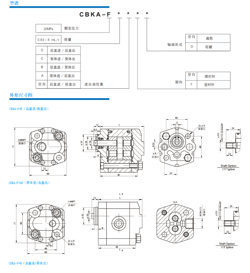 CBKA齿轮泵系高压小排量齿轮油泵,由一对高强度齿轮、轴套、泵体、前盖、后盖等主要部件组成,