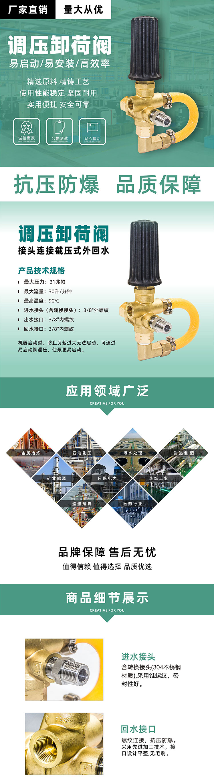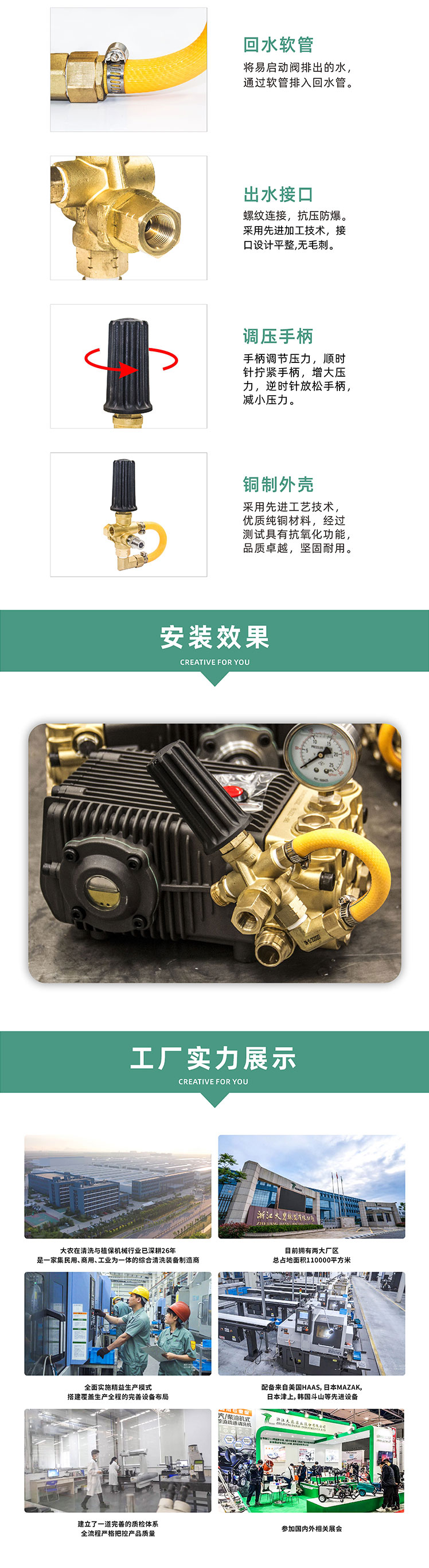通用截压式外回水调压卸荷阀,在回水状态下出水单向阀关闭,通过外回流通路排水并将泵头卸荷。