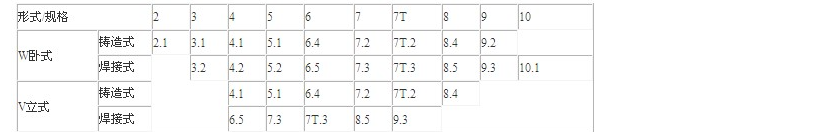 我公司双螺杆泵分立式、卧式两大类,规格有2,3,4,5,6,7,7T,8,9,10共10个,其品种与规格的型号组合见下表: