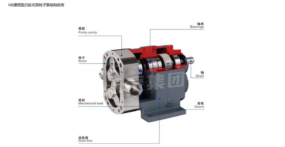 凸轮式双转子泵采用两个同步运转的转子,由箱体内一对同步齿轮进行传动,转子在主、副轴的带动下,进行同步反方向旋转,使泵的容积产生变化,