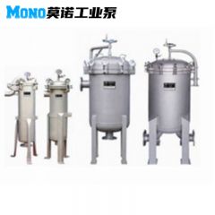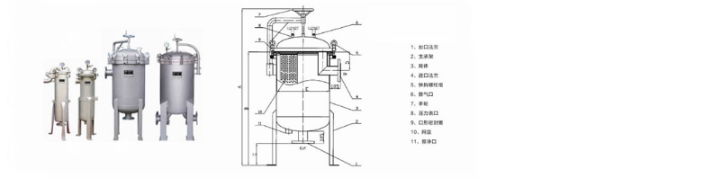 袋式过滤机是一种压力式过滤装置,主要有过滤筒体、过滤筒盖和快开机构、不锈钢滤袋加强网等主要部件组成,滤液由过滤机外壳的旁侧入口管流入滤袋,