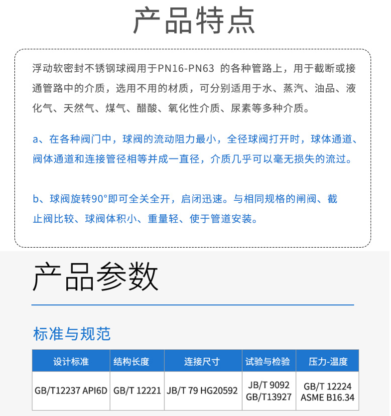 不锈钢球阀用于PN16-PN63的各种管路上,用于截断或接通管路中的介质,选用不用的材质,