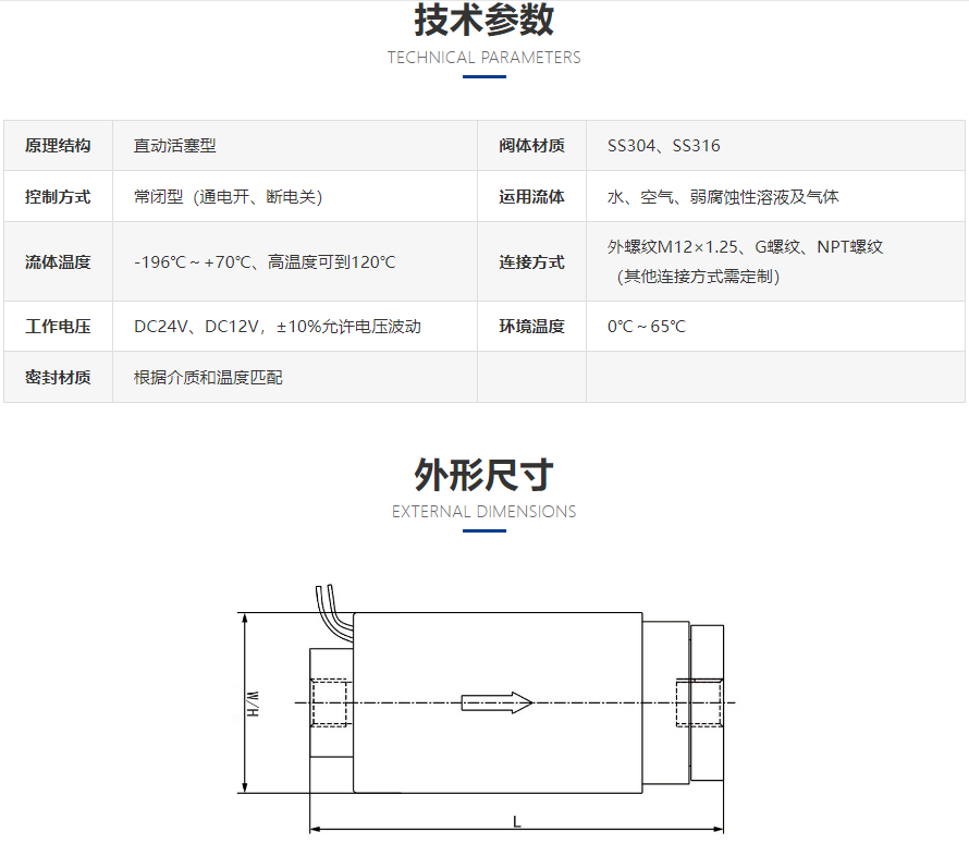 工作原理:本产品为直流螺管式电磁阀。平时阀芯在弹簧力作用下关闭、切断流体。如果激磁线圈接通电源即产生电磁力,吸动阀芯使工作介质通过。