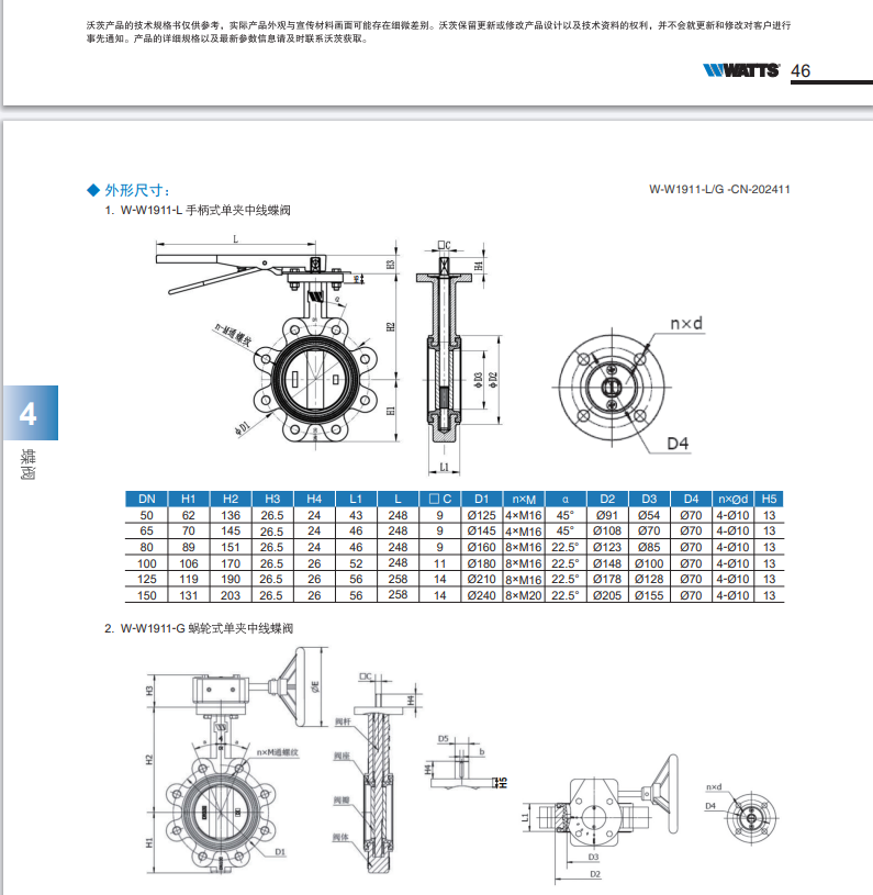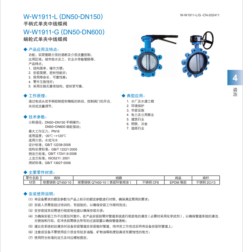 手柄式对夹中线蝶阀; 蜗轮式对夹中线蝶阀W-W1911-L/W-W1911-G