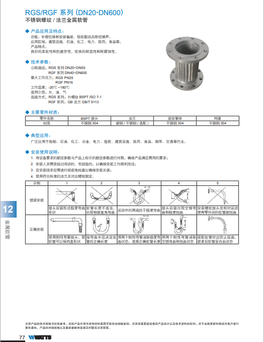 RGS/RGF 系列不锈钢螺纹 / 法兰金属软管可补偿位移和安装偏差、吸收振动及降低噪声。应用于建筑设施、石油、化工、电力、医药,食品等行业。