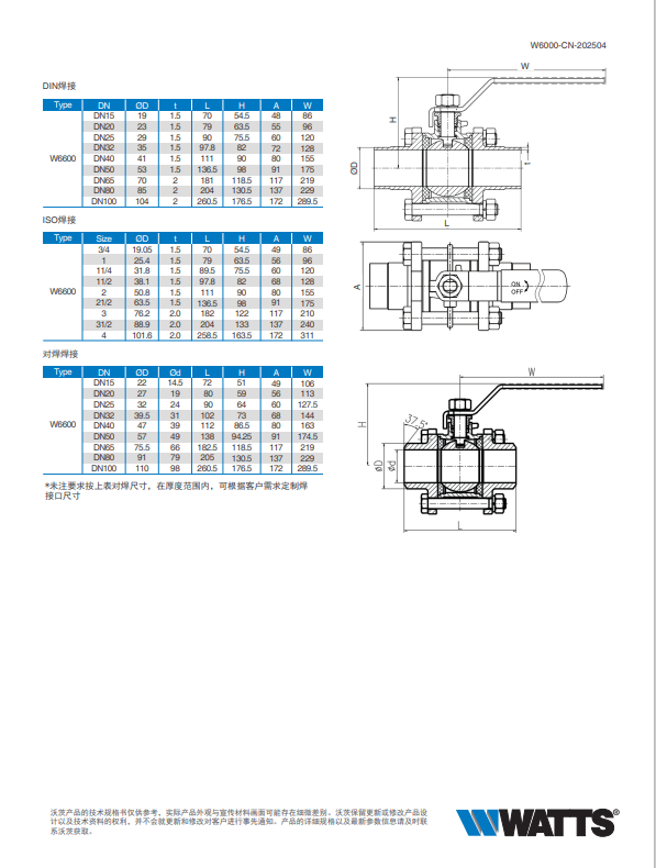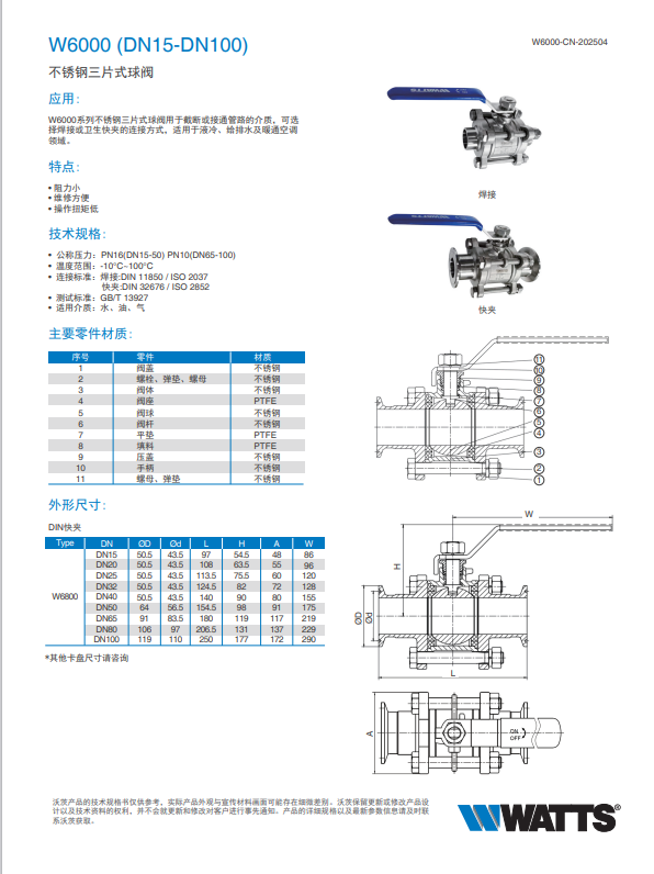 W6000系列不锈钢三片式球阀用于截断或接通管路的介质,可选择焊接或卫生快夹的连接方式,适用于液冷、给排水及暖通空调领域。