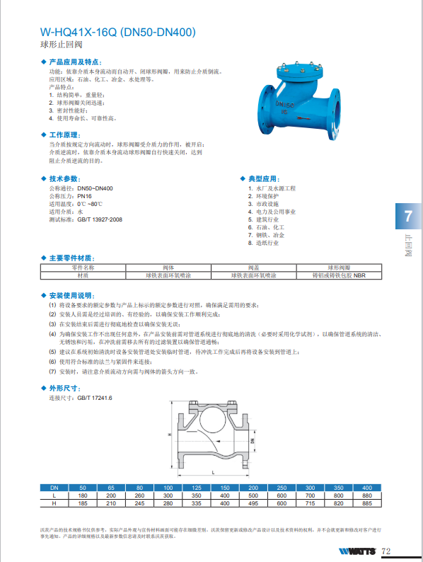 功能:依靠介质本身流动而自动开、闭球形阀瓣,用来防止介质倒流; 应用区域:石油、化工、冶金、水处理等;