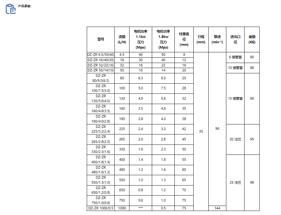 DZ-ZR 型柱塞式计量泵通过柱塞往复运动吸入和排出介质,流量范围 0-1000L/H,压力范围 0-50Mpa,