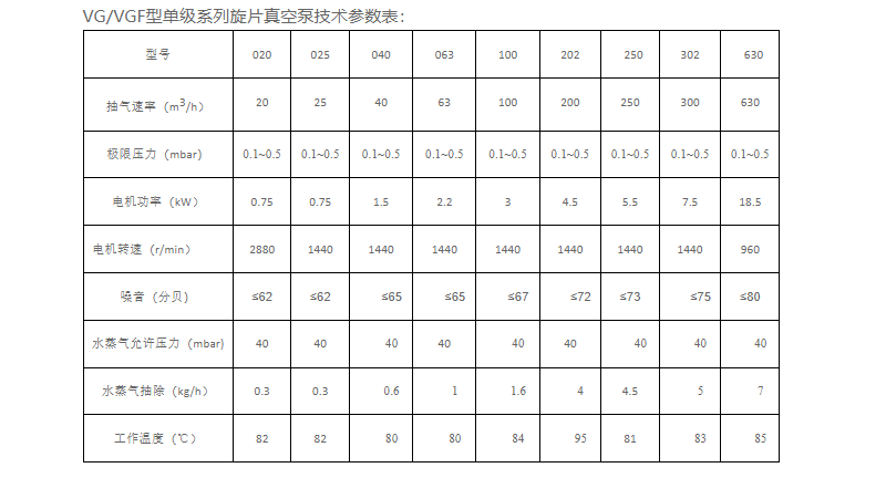VG/VGF型单级系列旋片真空泵技术参数表: